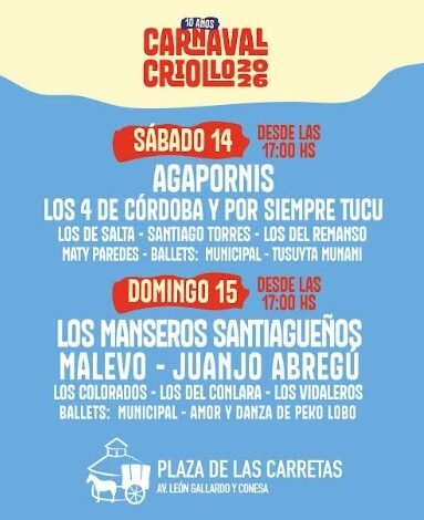 Se acerca el carnaval y los sanmiguelinos se preparan para celebrarlo con dos noches a pura música y folklore. El tradicional Carnaval Criollo se realizará en la Plaza de Las Carretas el sábado 14 y domingo 15 de febrero a partir de las 17hs.