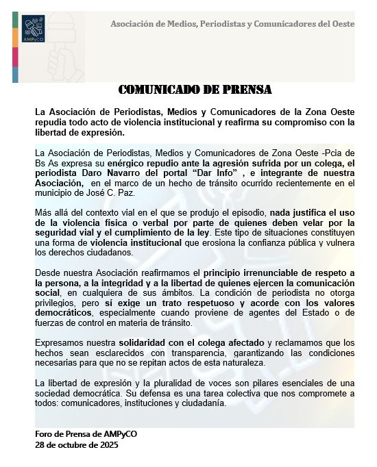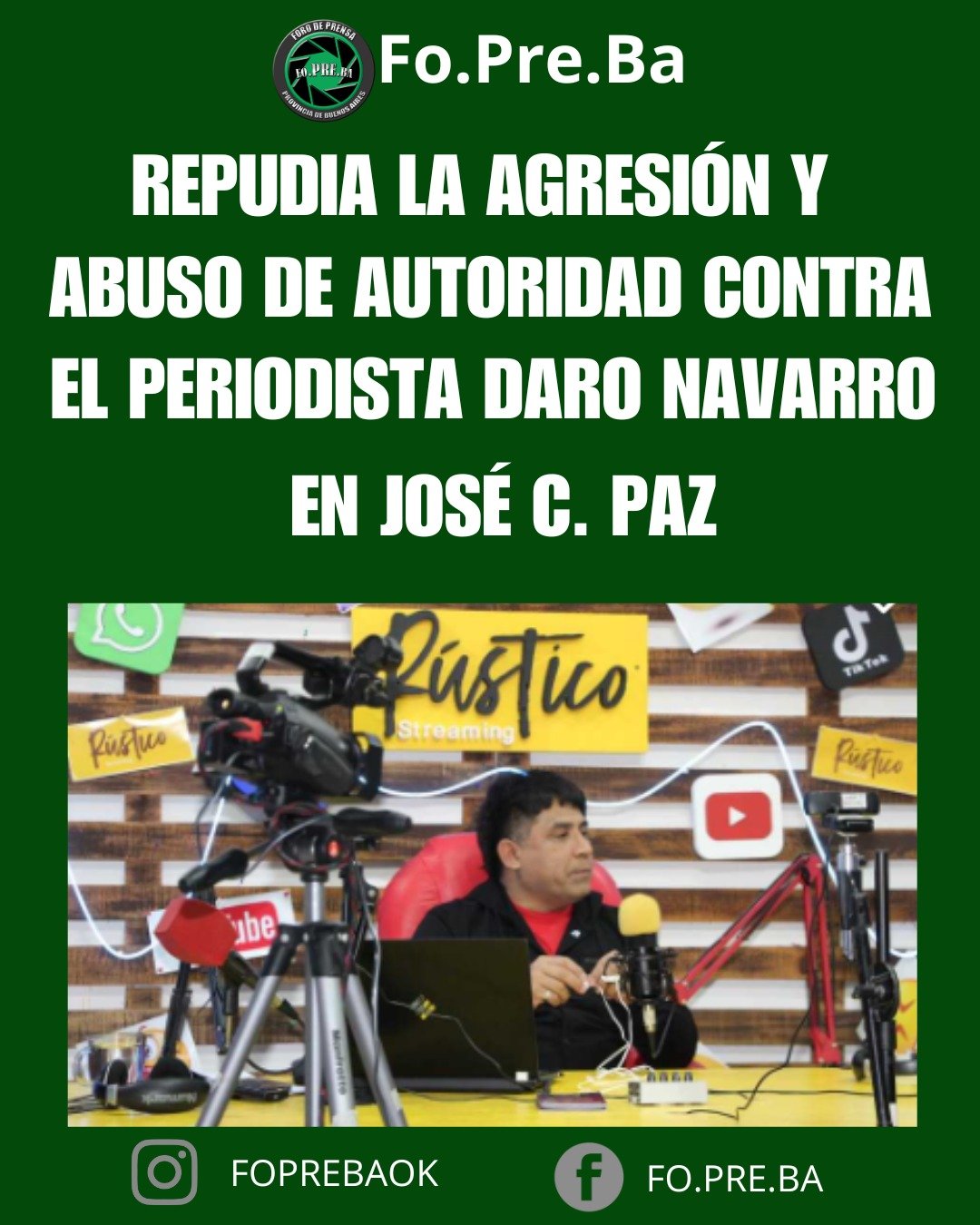 El Foro de Prensa Buenos Aires (FOPREBA) expresó su enérgico repudio ante el episodio de violencia y abuso de autoridad sufrido por el periodista Daro Navarro, director del portal Dar Info y del streaming Rústico, durante un hecho ocurrido el jueves pasado en el distrito de José C. Paz.